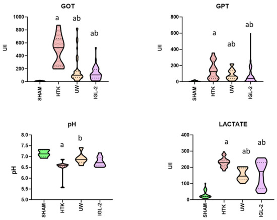 Relationships among transaminase activity (GOT, GPT), pH levels, and lactate concentration. This figure shows the release of transaminases (GOT and GPT), lactate levels, and pH in perfusates from fatty livers subjected to 24-h cold storage in IGL-2, HTK, and UW solutions. Control group without ischemia (SHAM) included. Results expressed as mean ± SEM. a p < 0.5 vs. SHAM, b p < 0.5 vs. HTK.