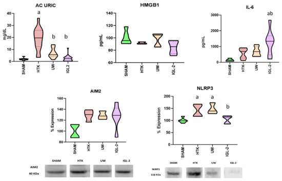 Association of uric acid, HMGB1, IL-6, AIM2, and NLRP3 levels in inflammatory responses. DAMPs measured as HMGB1 and acid uric, inflammasome, measured as AIM2 and NLRP3 and inflammatory related cytokines measured as IL-6 levels were assessed. Results expressed as mean ± SEM. a p < 0.5 vs. SHAM, b p < 0.5 vs. HTK.