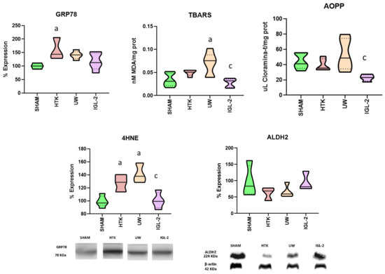 We observed an increase in ERS in the HTK group compared to UW and IGL-2. Despite this, we observed higher lipoperoxidation in the UW group compared to the others, with the IGL-2 group showing the least lipoperoxidation among the ischemic groups for the markers TBARS, AOPP, and 4-HNE. Regarding the latter marker, we noted that its antagonist, the mitochondrial enzyme ALDH2, although not significantly different from the other groups, showed an upward trend in the IGL-2 group (Figure 3).