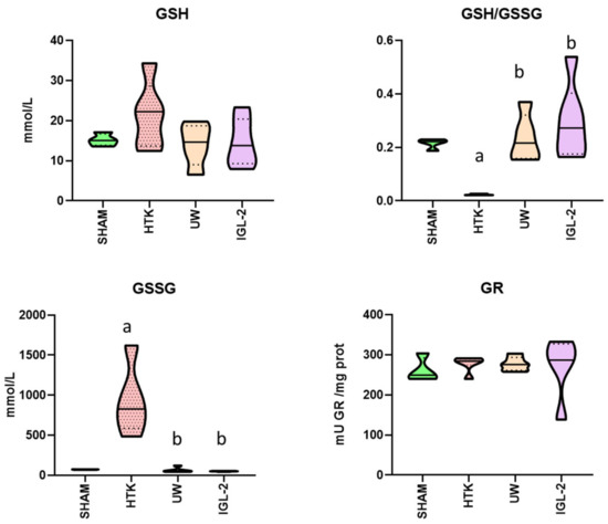 Given that labile glutathione is present as an antioxidant additive in all solutions except HTK, we evaluated the disruption in the balance between reduced glutathione (GSH) and oxidized glutathione (GSSG) and glutathione reductase (GR) after this 24-h cold ischemic period.