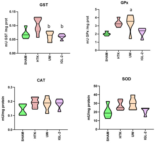 We observed lower levels of GST in the UW and IGL-2 groups compared to HTK. These lower levels were maintained only in the IGL-2 group for GPx. Although no significant differences were observed between the groups for CAT and SOD, there was a downward trend in the IGL-2 group for SOD (Figure 5).