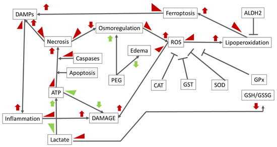 The scheme illustrates the interconnections among various biochemical pathways. Increases and decreases in compound levels are depicted at the respective points of their occurrence (beginning of grey arrows) with increment shape, while thick arrows indicate the influence (pointing upwards, increasing, pointing downwards, decreasing) on subsequent pathways at the end of the grey arrows. Negative impacts on overall cellular damage are highlighted in red, whereas beneficial cytoprotective effects are shown in green. In the scheme we observe that an increase in ROS is associated with greater damage, while an increase in ATP is associated with its reduction.