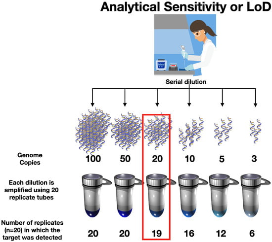 During the development phase, the LoD, one of the assessments that define an assay’s “analytical sensitivity” [], is an important metric that delineates the smallest quantity or concentration of the virus that can be detected consistently by an RT-qPCR assay []. LoD is usually assessed by running a large number of viral samples that contain progressively fewer and fewer target molecules under precise lab conditions on a specific instrument to make sure that the assay works correctly and to determine how small a viral sample the test can consistently detect (Figure 1) []. It provides a measure of how well the test performs under ideal and strictly monitored conditions.