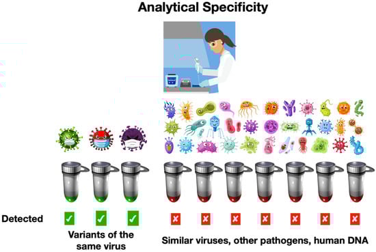 Analytical specificity measures how good a diagnostic test is at correctly finding the infectious agent it is supposed to detect without getting confused by other pathogens that may be almost the same []. There are two parts to this (Figure 2) []: