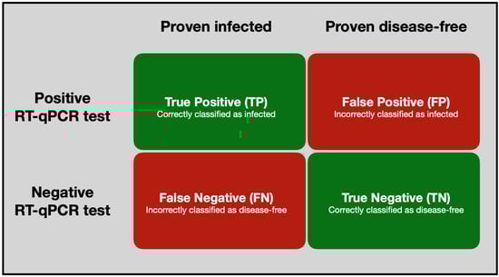 The performance evaluation of diagnostic RT-qPCR assays extends beyond their assessment as research tools and requires additional criteria specific to clinical applications to be considered. Whilst performance metrics obtained during an assay’s development in a controlled laboratory environment are important, they primarily reflect ideal conditions and may not directly translate to real-world diagnostic scenarios. Consistency in diagnostic performance across different testing sites requires an optimised and standardised workflow, a condition that is often not met in practice []. Therefore, while laboratory-based metrics provide a foundational understanding of assay performance, the clinically relevant evaluation is determined by metrics that characterise the assay’s effectiveness in accurately diagnosing diseases in individual patients [].