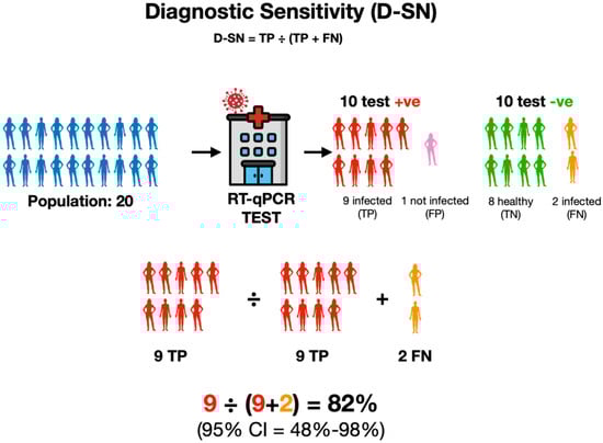 Diagnostic sensitivity emphasises the ability of a test to catch all actual positives without considering any false-positive results. It is expressed as the percentage of true-positive tests out of all individuals who are known to be infected, regardless of whether they tested positive (TP) or not (FN). In this example, in a population of 20 individuals shown in blue, eleven were infected, but only nine tested positive by RT-qPCR (+ve, red, TP), whereas two tested negative (-ve, orange, FN). One of the nine patients testing positive was healthy (pink, FP). The sensitivity is therefore calculated by dividing the number of true positive tests (9) by the total number of tests that should have been positive (11).