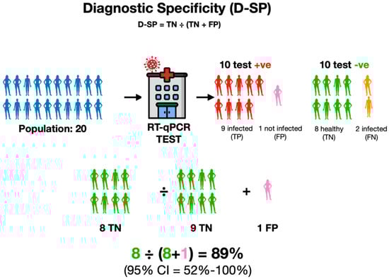 Diagnostic specificity measures the ability of the test to correctly detect all actual negatives without considering any false negatives. It is expressed as the percentage of all true-negative tests out of all individuals who are known not to be infected, regardless of whether they tested negative (TN) or not (FP). In this example, in a population of 20 individuals shown in blue, nine individuals were healthy, but only eight tested RT-PCR negative (-ve, green, TN), whereas one tested positive (pink, FP). The specificity is therefore calculated by dividing the number of true positive tests (8) by the total number of tests that should have been negative (9).