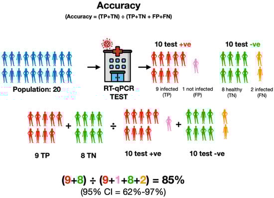 Accuracy is a measure of how well the test identifies both TP and TN and does not consider FP and FN. It is expressed as the percentage of all true-positive and all true-negative tests out of all individuals that have been tested. In this example, in a population of 20 individuals shown in blue, there were nine true-positive (TP, red) and eight true-negative (TN, green) individuals. Since 20 individuals were tested, accuracy is calculated by dividing the 17 individuals with a correct test by all 20 individuals tested, even though there are one FP (pink) and two FN (orange) amongst them.