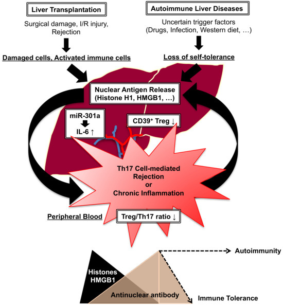 Mechanical similarities and differences between liver transplant immunology (rejection or tolerance) and autoimmune liver diseases. Although the trigger of nuclear antigen release is different, damaged cells and activated immune cells may release nuclear antigens such as histone H1 and HMGB1, resulting in the induction of rejection and inflammatory responses. Overexpression of hepatic miR-301a may lead to the production of IL-6 for the induction of Th17 cell differentiation during rejection and autoimmune liver diseases. The reduction in CD39+ Treg in the liver may be associated with liver transplant rejection and autoimmune liver diseases partly through the activation of Th17 cells. The reduction in the Treg/Th17 ratio has been proposed as a predictive marker for rejection or autoimmune liver diseases. In some circumstances, the transient induction of antinuclear antibody against histone H1 or HMGB1 may neutralize nuclear antigens, resulting in the induction of immune tolerance in experimental animals. However, the long-term elevation of antinuclear antibody may be associated with a loss of immune homeostasis. I/R injury: ischemia/reperfusion injury, HMGB1: high mobility group box 1, Treg: regulatory T cells.