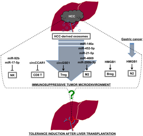 Hepatocellular carcinoma (HCC) is the most common type of primary liver cancer, and the recurrence of HCC after surgical resection or liver transplantation is one of critical issues impacting mortality in HCC patients [132]. In general, transplant immunology and tumor immunity function in the opposite fashion for host protection. In other words, the mechanism of action of transplant rejection may be applicable for the activation of tumor immunity (tumor immune surveillance). In this review, we have focused on the impact of HCC-derived exosomal components, including microRNAs for immune modulation.