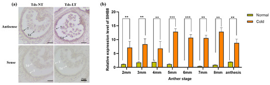 Preliminary research indicated that SlHB8 is expressed in both the tapetum and microspores from the microsporocyte stage to the maturation of pollen grains under normal temperatures []. To explore how SlHB8 expression changes in anthers under cold stress, we analyzed its spatiotemporal pattern during the tetrad stage using in situ hybridization. Our findings indicated that at normal temperatures, positive signals for the antisense probe were present throughout the anther at this stage, with stronger signals observed in the tapetum and microspores (Figure 1a). However, exposure to low temperatures resulted in significantly stronger positive signals across the anther—especially within tapetal cells and microspores (Figure 1a). Quantitative PCR results also confirmed increased levels of SlHB8 expression in anthers during the pollen development after low-temperature treatment (Figure 1b), implying that SlHB8 may be involved in regulating pollen development and tapetum degradation during cold stress.