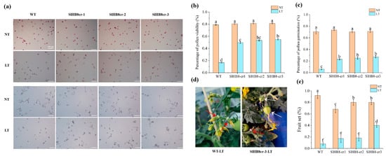 Pollen viability and pollen tube gemination of SlHB8 gene knockout plants. Buds of 4 mm in size (tetrad stage) were labeled, subjected to cold treatment for seven days, and subsequently cultivated at normal temperature until the labeled flowers were fully open, at which point anthers were harvested for pollen viability assessment. (a) Pollen TTC staining (upper) and in vitro germination tests (lower) on pollen were analyzed in the wild type and SlHB8 mutants under normal and cold conditions. Scale bars = 100 μm. (b) The pollen vitality of WT and SlHB8 mutants under normal temperature and cold stress. Scale bars = 100 μm. (c) The pollen tube germination rate of WT and SlHB8 mutants under normal temperature and cold stress. The data are representative of at least 30 samples, quoted as the mean ± standard deviation, with a Tukey HSD, p-value < 0.05. (d) Image depicting the fruit set of the wild type and slhb8 after low-temperature stress at the tetrad stage. White arrows denote successful fruit sets; red arrows indicate failures. (e) Fruit-set rates of the wild type and slhb8 mutants under normal and low-temperature stress. A minimum of 10 plants per genotype were evaluated. Data are reported as the mean ± standard deviation. Significant differences in mean values are indicated by the letters a–f: Tukey HSD, p < 0.05.