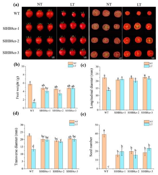 Fruit morphology analysis of the wild type and slhb8 mutants under normal and cold conditions. (a) Fruit images of the wild type and hb8 mutants under normal and low-temperature treatments; (b) the weight of tomato fruits from the wild type and slhb8 mutants under normal and cold stress; the longitudinal diameter (c) and transverse diameter (d) of tomato fruits from the wild type and slhb8 mutants under normal and cold stress; (e) the seed number per tomato fruit of the wild type and slhb8 mutants under normal and cold stress. Data are expressed as the mean ± standard deviation. Significant differences in mean values are indicated by the letters a–d: Tukey HSD, p < 0.05.
