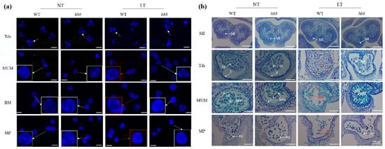To more accurately distinguish the stages of pollen development, we classified flower buds into eight flowering stages based on their morphology and size, ranging from 2 to 8 mm. We confirmed the accuracy of these stages by using DAPI staining to examine the microspore size by microscopy. The results showed that at room temperature, there were no noticeable differences in pollen morphology between wild-type and hb8 mutant plants throughout various developmental stages. However, under cold stress conditions, both WT and hb8 mutants formed normal tetrads during the microspore stage, but abnormalities appeared in WT pollen after this stage; pollen grains with no visible nuclei and shrunken appearances were noted (Figure 4a). In contrast, the hb8 mutant pollen maintained a normal appearance (Figure 4a).