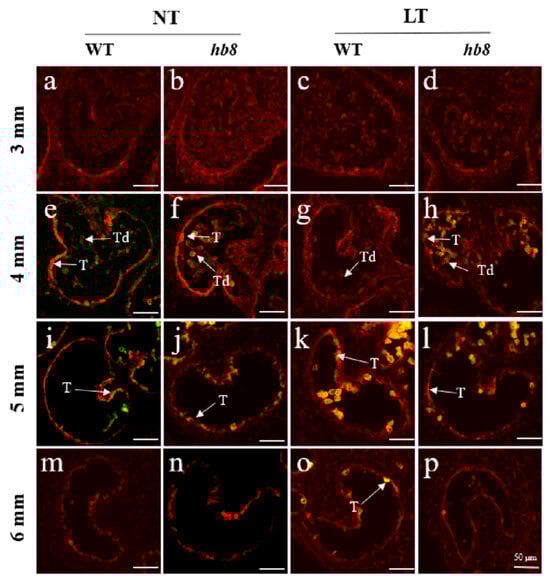 Fluorescence microscopy of DNA fragmentation detected by TUNEL assays of anthers from the wild type and slhb8 mutant under both normal and cold stress. (a,e,i,m) represent wild type anthers of 3 mm, 4 mm, 5 mm, and 6 mm length at normal temperature; (b,f,j,n) represent slhb8 anthers of 3 mm, 4 mm, 5 mm, and 6 mm length at normal temperature; (c,g,k,o) represent wild type anthers of 3 mm, 4 mm, 5 mm, and 6 mm length under low temperature; (d,h,l,p) represent slhb8 anthers of 3 mm, 4 mm, 5 mm, and 6 mm length under low temperature; The hb8 mutant was SlHB8 -cr3; 3 mm: flower bud of 3 mm length; 4 mm: flower bud of 4 mm length; 5 mm: flower bud of 5 mm length; 6 mm: flower bud of 6 mm length; T: tapetum; Td: tetrad; Scale bars = 50 μm.