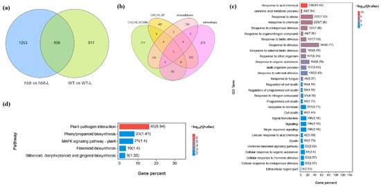 Identification of differentially expressed genes (DEGs) responsible for the cold resistance in slhb8 anthers. (a) Venn diagram analysis of genes differentially expressed in WT and slhb8 before and after cold treatment; (b) Venn diagram analysis of genes with opposite expression trends in WT and slhb8 before and after cold treatment. (c) GO analysis of specifically differentially expressed genes in hb8 (1253 + 42 = 1295); (d). KEGG pathway analysis of the specifically differentially expressed genes (1295) in hb8. The hb8 mutant was SlHB8-cr3.