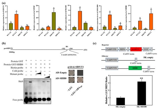 Upon analyzing the promoter sequence of SlDYT1, we found a binding site for SlHB8 (Figure 7b). Then, we performed Y1H and EMSA to confirm the binding of SlHB8 with the SlDYT1 promoter. Meanwhile, we also carried out dual luciferase assays to confirm the regulation of SlHB8 on the SlDYT1 promoter. The results showed that SlHB8 could bind the promoter of SlDYT1 and activate the expression of SlDYT1 (Figure 7b,c), indicating that SlHB8 may serve as an upstream regulator of SlDYT1 and influence tapetum layer degradation by modulating its expression (Figure S2 and Figure 7).