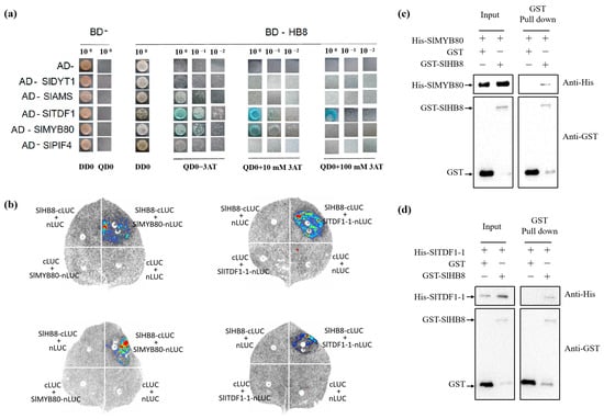 We co-transformed various pGADT7 recombinant plasmids (AD-SlDYT1, AD-SlTDF1, AD-SlPIF4, AD-SlAMS, AD-SlMYB80) with the BD-SlHB8 plasmid into the AH109 yeast strain to test for protein interactions. The BD-SlHB8 showed minor self-activation which was completely suppressed at a 10 mM concentration of 3AT. Notably, yeast strains harboring both AD-SlTDF1and BD-SlHB8 or AD-SlMYB80 and BD-SlHB8 grew on quadruple dropout media containing 10 mM 3AT and exhibited blue colonies during X-alpha-gal screening (Figure 8a). In contrast, the negative control only grew on double dropout media but not on quadruple dropout plates. This suggests that within the yeast system, there are specific interactions between SlHB8 and both SlTDF1 and SlMYB80 proteins; however, no interaction was detected between SlHB8 and either SlDYT1, SlPIF4, or SlAMS (Figure 8a). These findings were further confirmed by a luciferase complementation assay and pull-down that validated the interactions between SlHB8 with SlMYB80 as well as SlTDF1 (Figure 8b–d).