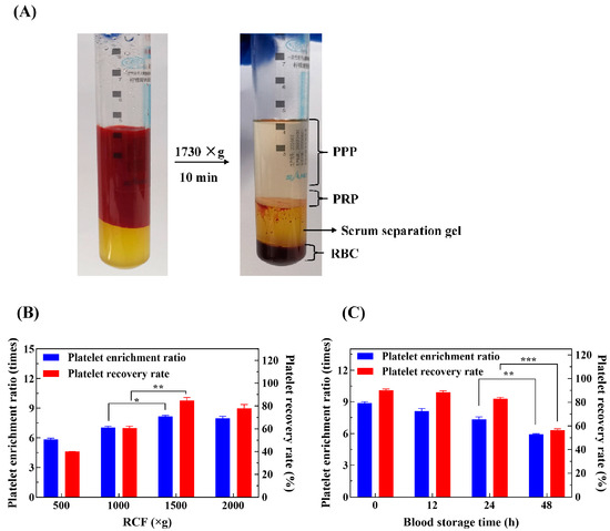 Blood samples are stored at 4 °C [36]. The platelet recovery rates and platelet enrichment ratios gradually decreased with the prolongation of blood storage time, as shown in Figure 1C. The platelet recoveries in the PRP extracted from blood stored for less than 24 h were more than 80%, with a platelet enrichment ratio of more than 7 times. After 48 h of storage, the platelet recovery rate in PRP was 56.43 ± 1.09%, and the platelet enrichment ratio was approximately 5.93 times. Experimental results show that the shorter the storage time of blood, the better it is for preserving the active components of PRP.