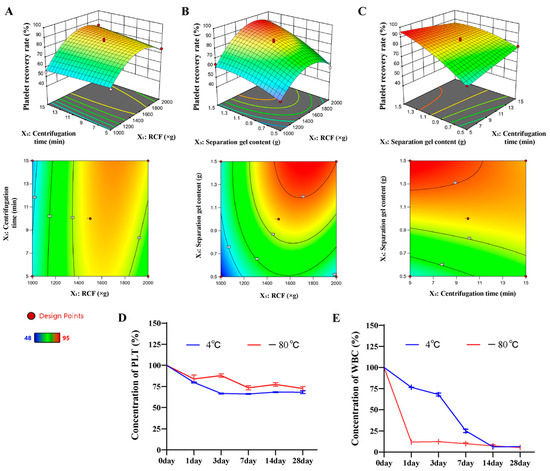 Figure 2. Response surface optimization experiment results and PRP stability analysis. (A) Centrifugation force and time, (B) centrifugation time and serum separation gel addition, (C) centrifugation time and amount of serum separation gel added, (D) change of PLT concentration from 0 to 28 d, (E) change of WBC concentration from 0 to 28 d.