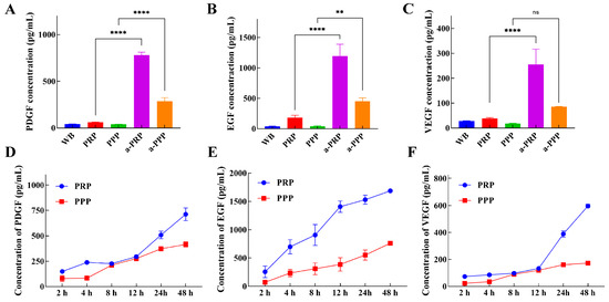 Figure 3. Growth factor analysis for PRP and PPP. (A) PDGF concentration, (B) EGF concentration, (C) VEGF concentration, (D) PDGF release curve, (E) EGF release curve, (F) VEGF release curve. (ns p > 0.05, ** 0.001 < p ≤ 0.01, **** p ≤ 0.0001).
