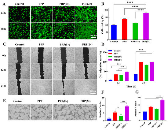 Figure 4. In vitro cellular effects of PPP and PRP with different enrichment ratios. (A) Live/dead fluorescence images of 3T3 cells after incubation for 24 h, (B) cell proliferation of 3T3 cells after culturing for 24 h before CCK-8 analysis, (C) images of 3T3 cells migration, (D) cell migration rate, (E) in vitro angiogenesis of HUVEC cells, (F) the number of meshes, (G) the number of meshes. (* p < 0.05, ** p < 0.01, *** p < 0.001, **** p < 0.0001).
