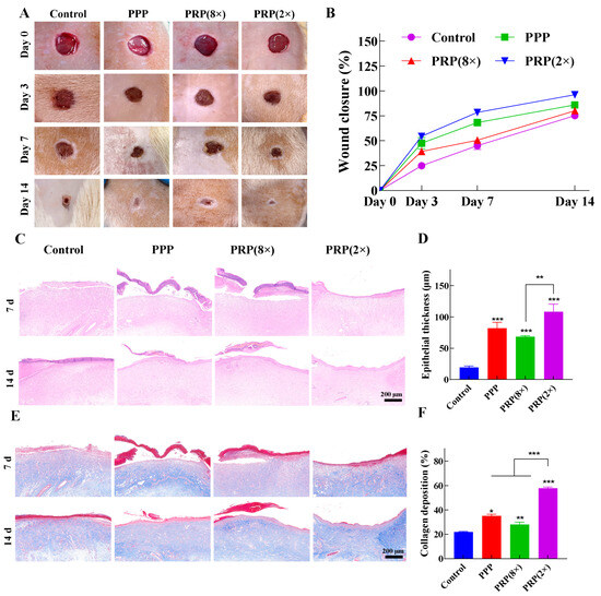Masson’s staining showed PRP (2×) had the highest collagen deposition on day 7, with the most organized fibers (Figure 5E). By day 14, all groups exhibited mature collagen, most orderly in PRP (2×). PRP (2×) had the highest collagen density (57.83%), followed by PPP and PRP (8×) (Figure 5F).