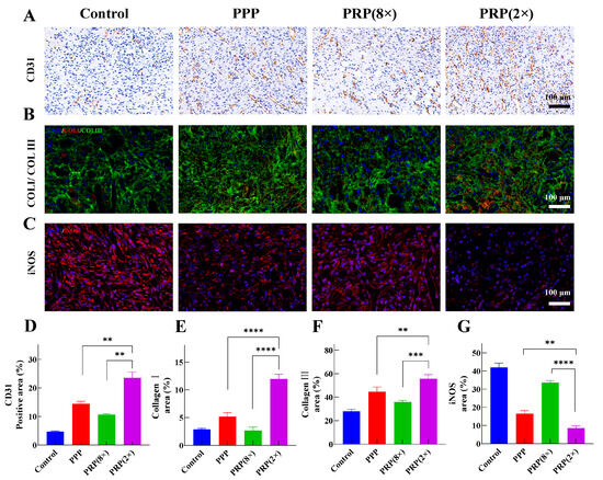 Collagen I and Collagen III can better facilitate wound healing and reduce the likelihood of scarring [45]. Fluorescent double staining of Collagen I/Collagen III showed that both PRP (2×) and PPP had good collagen generation capabilities, which could promote wound healing, the positive expression level of Collagen I reaches 11.95%, while Collagen III reaches 55.68%. Additionally, inducible nitric oxide synthase (iNOS) is responsible for catalyzing the generation of stressful high concentrations of nitric oxide. Pro-inflammatory cytokines first induce the production of large amounts of inducible nitric oxide synthase [46]. iNOS staining results indicated that compared to the PPP group, the wounds in the PRP (2×) group exhibited lower levels of inflammation. PRP with lower concentrations has demonstrated greater activity in promoting cell proliferation and wound healing, which may have significant implications for clinical treatments, especially in the management of skin trauma and burns.