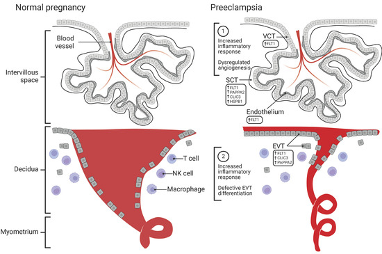 - Yang, J.; Gong, L.; Liu, Q.; Zhao, H.; Wang, Z.; Li, X.; Tian, W.; Zhou, Q. Single-cell RNA-seq reveals developmental deficiencies in both the placentation and the decidualization in women with late-onset preeclampsia. Front. Immunol. 2023, 14, 1142273. [Google Scholar] [CrossRef]