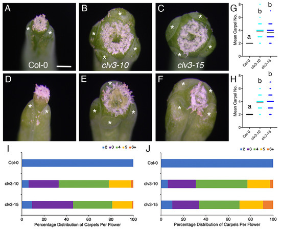 The carpel number of wild-type and clv3 plants grown in long-day or short-day conditions. (A) Col, (B) clv3-10, and (C) clv3-15 carpels in LD conditions and (D) Col, (E) clv3-10, and (F) clv3-15 carpels in SD conditions. (G,H) The mean carpel number in (G) long-day and (H) SD conditions. (I,J) The percentage distribution of carpels per flower in (I) LD and (J) SD conditions. White asterisks denote carpels. Black bars indicate the mean. Lower case letters indicate statistically significant differences (p < 0.001). n = 100 gynoecia per genotype. Scale bar, 1 mm.