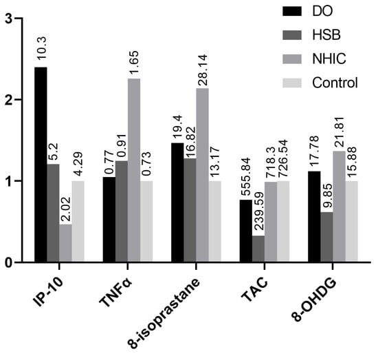 Significant differences were observed in urine biomarkers among the different groups (Table 1). Patients with NHIC had significantly lower levels of IL-2 and higher levels of TNF-α compared to the other groups. Patients with DO exhibited significantly higher levels of IP-10 and MIP-1β. Patients with HSB had significantly lower levels of TAC and 8-OHdG compared to the NHIC and control groups. The ratio of each significant urine biomarker level in sensory bladder disorder groups to control is shown in Figure 1.