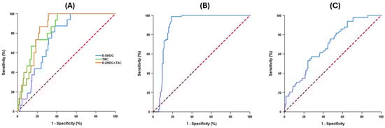 ROC curve analysis for urine cytokines. (A) HSB vs. total patients: ROC curves for 8-OHdG, TAC, and the combination of 8-OHdG + TAC. 8-OHdG shows an AUC of 0.754 with a cut-off value of ≤14.705, sensitivity of 87.5%, and specificity of 62.0%. TAC shows an AUC of 0.844 with a cut-off value of ≤528.720, sensitivity of 100%, and specificity of 59.5%. The combination of 8-OHdG and TAC shows an AUC of 0.853 with a cut-off value of ≤0.138, sensitivity of 100%, and specificity of 68.6%. The cut-off value for the combination was determined using a multiple regression model with the regression equation: y = 0.218 − 0.003 × 8-OHdG − 0.0000675 × TAC. Blue line: 8-OHdG; green line: TAC; orange line: 8-OHdG + TAC; red dash line: reference line. (B) NHIC vs. total patients: ROC curve for TNF-α with an AUC of 0.889, a cut-off value of ≥1.050, sensitivity of 98.8%, and specificity of 81.3%. Red dash line: reference line. (C) DO vs. total patients: ROC curve for IP-10 with an AUC of 0.695, a cut-off value of ≥6.310, sensitivity of 57.1%, and specificity of 72.3%. red dash line: reference line. Abbreviations: DO—detrusor overactivity, HSB—hypersensitive bladder, NHIC—non-Hunner type interstitial cystitis/bladder pain syndrome, TNF—tumor necrosis factor, TAC—total antioxidant capacity, and 8-OHdG—8-hydroxydeoxyguanosine.