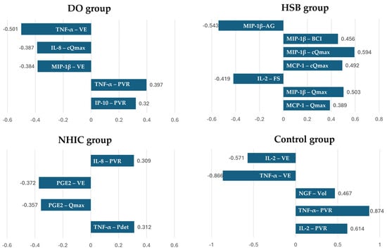 We compared the associations between different urinary biomarkers and VUDS parameters across the four groups. Significant strong associations (defined as a coefficient > 0.6) were observed between the urinary biomarkers and the VUDS parameters in the control group. Notably, PVR showed a positive correlation with TNF-α (γ = 0.874) and IL-2 (γ = 0.614). Voiding efficacy demonstrated a negative correlation with TNF-α (γ = −0.866). Some moderate associations (defined as a coefficient between 0.4 and 0.6) were also found across the control, DO, and HSB groups (Figure 3).