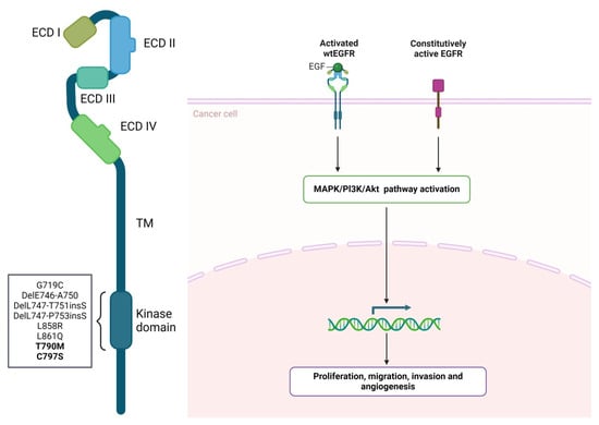 EGFR mutations and signaling in cancer. Kinase-activating mutations and EGFR overexpression are responsible for EGFR signaling amplification, which defines the typical cancer cell: uncontrolled proliferation and survival. EGFR-targeted therapy improves patient prognosis. Nonetheless, secondary mutations can emerge (T790M and C797S, in bold), giving rise to resistant cancer cells. Adapted from “EGFR and EGFRvIII Roles in Cancer Biology” by BioRender.com. Retrieved from https://app.biorender.com/biorender-templates, (accessed on 31 July 2024) [,].