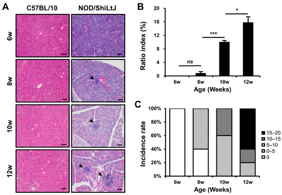 Histopathologic changes in the submandibular glands (SMGs) from NOD/ShiLtJ mice. (A,B) Hematoxylin and eosin-stained sections of the SMGs show focal inflammatory foci (indicated by black arrow heads). The severity of inflammation of the SMGs is assessed by ratio index ([area of inflammation/total glandular area of the section] × 100). (C) Both incidence rate and severity of inflammation in the SMGs show an increase with age. Inflammatory changes can be observed in all salivary gland tissues of 10- and 12-week-old mice and are more intense in 12-week-old mice than in 10-week-old mice. n in each group = 5. Bars show the mean and S.E.M for each group. ns = not significant; * = p < 0.05, *** = p < 0.001. Scale bar = 100 µm.