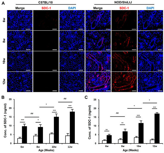The SDC-1 concentrations in the blood (Figure 2B) and SMGs (Figure 2C) significantly increased in NOD/ShiLtJ mice compared with those in controls, which tended to increase with the severity of inflammation in the salivary gland tissues. Moreover, the SDC-1 concentrations in the blood and SMGs of NOD/ShiLtJ mice started to increase significantly at 6 weeks of age (blood, 9.6 ± 1.2 vs. 2.8 ± 0.6, p < 0.001; SMG, 4.6 ± 0.6 vs. 1.6 ± 0.4, p = 0.002), during which no inflammatory response was detected in the SMGs of NOD/ShiLtJ mice. In the NOD/ShiLtJ mice, SDC-1 concentrations in the blood and SMG of 8-week-old mice tended to increase compared with those of 6-week-old mice, although the differences were not statistically significant. SDC-1 concentrations in the blood and SMGs started to show a significant increase at 10 weeks of age (8-week-old vs. 10-week-old mice: blood, 9.2 ± 1.4 vs. 15.0 ± 1.6, p = 0.025; SMG, 6.8 ± 1.3 vs. 11.5 ± 1.3, p = 0.047).