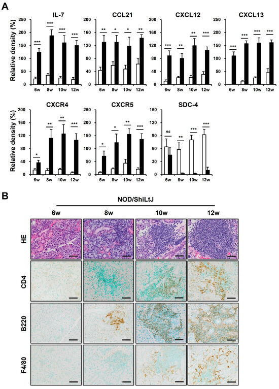 We performed a Western blotting assay for these chemokines to identify altered expressions of chemokines in inflamed salivary gland tissues of NOD/ShiLtJ mice (Figure 3A). In 6-week-old NOD/ShiLtJ mice without SMG inflammation, the expressions of IL-7, CCL21, and CXCL13 were significantly upregulated, suggesting that SGECs begin to secrete inflammatory substances such as chemokines before inflammatory cell infiltration. The expression of CXCR4 and CXCR5 also increased in the SMGs of 6-week-old NOD/ShiLtJ mice, but the expression levels were not so high. In 8-week-old mice, a more pronounced increase in the expression of IL-7 and CXCL13 occurred, when salivary gland inflammation began to be observed. The expressions of CXCR4 and CXCR5 were evident from 8 weeks, which is considered to be related to the fact that B cell infiltration increases in earnest in the SMGs of 8-week-old NOD/ShiLtJ mice. Along with the changes in the expression of chemokines, we also identified changes in the expression of SDC-4. SDC-4 was expressed to a similar extent in the SMGs from 6-week-old NOD/ShiLtJ mice as in those of control mice, but was barely detectable in the SMGs from 8-week-old mice, when the inflammatory responses began to develop (Figure 3A). Additionally, infiltration of inflammatory cells, including B cells, T cells, and macrophages, increased with age in the salivary glands of NOD/ShiLtJ mice, along with increased concentrations of chemokines.