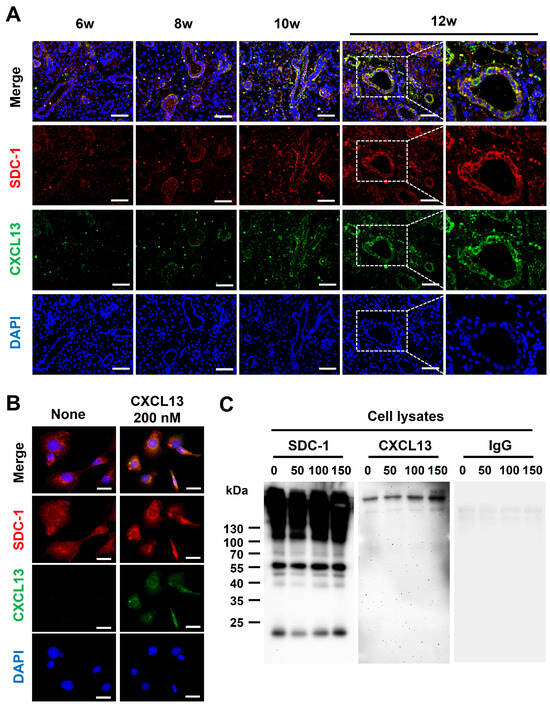 Identification of CXCL13 binding to syndecan-1 (SDC-1). (A) Co-expression of SDC-1 and CXCL13 in submandibular gland tissues of NOD/ShiLtJ mice. Each section was double-stained with immunofluorescent antibodies to determine the distribution of SDC-1 (CD138, red) and CXCL13 (green) on the epithelial cells. The sections were counterstained with 4′,6-diamidino-2-phenylindole (DAPI, blue). The merged images obtained by confocal microscopy show the yellow co-localization of both molecules. Magnified views of the boxed areas are shown in the right column. Scale bars = 50 and 25 µm. (B) Co-expression of SDC-1 and CXCL13 on normal murine mammary gland (NMuMG) cells. NMuMG cells were double-stained with anti-CXCL13 mAb (green) and anti-SDC-1 mAb (red). The sections were counterstained with DAPI (blue). Scale bar = 25 µm. (C) Association of SDC-1 with CXCL13 at the cell surface of NMuMG cells. NMuMG cells were incubated with 0, 50, 100, and 150 nM recombinant mouse CXCL13 for 18 h. The cell pellets of NMuMG cells were harvested following the protocol outlined in the Pierce™ Classic Magnetic IP/Co-IP Kit. The cell lysates were incubated with mouse anti-SDC-1 antibody, and anti-SDC-1 antibody binding complexes were analyzed by Western blotting assay with antibody against CXCL13 (Novus Biologicals, Centennial, CO, USA) or rat immunoglobulin G (control, Santacruz, Dallas, TX, USA).