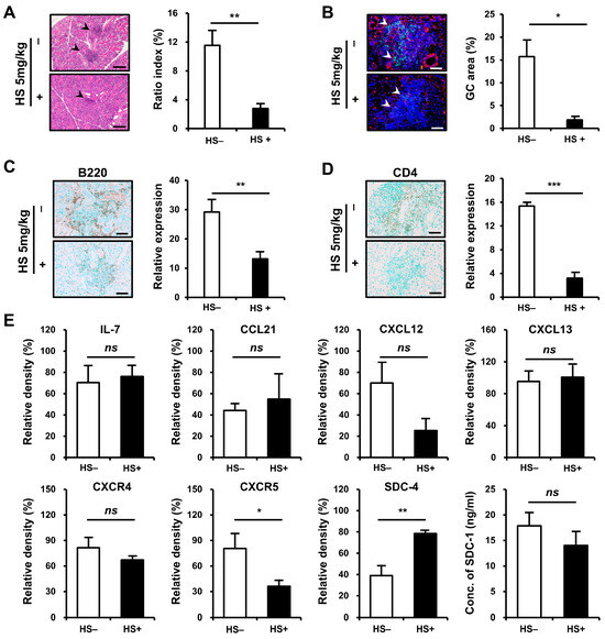Therapeutic efficacy of heparan sulfate (HS) treatment on inflammatory cell infiltration in the submandibular gland (SMG) of NOD/ShiLtJ mice. Female NOD/ShiLtJ mice were treated with either a phosphate-buffer solution (n = 5) or HS (5 mg/kg, 3 times/week) (n = 5) for 5 weeks beginning at 6 weeks of age. (A) Representative histopathologic findings (left panels) and histologic scores (ratio index, right) of SMG sections from controls and HS-treated mice. Focal inflammatory foci are indicated by black arrow heads. Scale bar = 100 μm. (B) Representative immunofluorescence staining for germinal center (GC, left panels) and measurement of GC area (right) tissue sections which were double-stained with anti-CXCR5 mAb (red) and anti-B220 mAb (green). The sections were counterstained with 4′,6-diamidino-2-phenylindole (DAPI, blue). Semiquantitative determination of T-cell infiltration was performed using Fiji (https://imagej.net/Fiji/Downloads, accessed on 15 July 2024). GCs are indicated by white arrow heads. Scale bar = 50 μm. (C) Representative immunohistochemical (IHC) staining for B cells (left panels) and measurement of B-cell infiltrates (right). Positivity is indicated by diaminobenzidine (DAB) precipitation (brown). Semiquantitative determination of B-cell infiltration was performed using Fiji (ImageJ). Scale bar, 50 μm. (D) Representative IHC staining for helper T cells (left panels) and measurement of T-cell infiltrates (right). Positivity indicated by DAB precipitation (brown). Semiquantitative determination of T-cell infiltration was performed using Fiji (ImageJ). Scale bar = 50 μm. (E) Western blotting assay for chemokines, chemokine receptors, and syndecans 4 and SDC-1. n in each group = 4. Bars show the mean and S.E.M for each group. ns = not significant; * = p < 0.05, ** = p < 0.01, *** = p < 0.001. □ placebo-treated group, ■ HS-treated group.