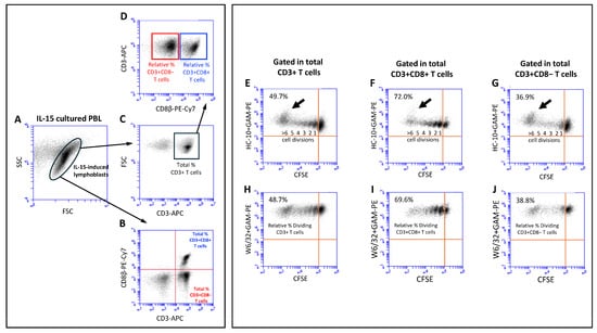 Gating strategies to study the phenotype and expression of the HC-10 and W6/32 epitopes in lymphoblasts induced by IL-15. (Left panel): Fresh PBLs were isolated, labeled with CFSE, and cultured for 12 days in the presence of IL-15, which was added at days 0 and 6, as indicated in Section 4. (A) Dot plot shows FSC versus SSC parameters of lymphoblasts at day 12 of culture with IL-15, illustrating the blast transformation of PBLs in response to IL-15. Small and larger blast cells can be observed. (B) Dot plot shows CD3 versus CD8 expression on gated IL-15-induced lymphoblasts, allowing for the determination of the percentage of total CD3+CD8+ T cells (upper right quadrant, URQ) and CD3+CD8− T cells (lower right quadrant, ULQ). (C) Dot plot shows CD3 versus FSC on gated IL-15-induced lymphoblasts, allowing for the determination of the percentage of total CD3+ T cells. (D) Dot plot shows CD8 versus CD3 expression on gated total CD3+ T cells (black square), allowing for the determination of the relative percentages of CD3+CD8+ T cells (blue square) and CD3+CD8− T cells (red square). (Right panel): Upper dot plots show CFSE halving versus HC-10 expression in total CD3+ T cells (E), total CD3+CD8+ T cells (F), and total CD3+CD8− T cells (G). The percentage of dividing cells (ULQ) and the number of cycles of cell divisions are indicated. Black arrow highlights the most dividing cells (≥5–6 division cycles). Lower dot plots show CFSE halving versus W6/32 expression in total CD3+ T cells (H), total CD3+CD8+ T cells (I), and total CD3+CD8− T cells (J). The percentage of dividing cells (ULQ) are indicated. These dot plots allowed us to determine the relative percentage of dividing CD3+ T cells, CD3+CD8+ T cells, and CD3+CD8− T cells.