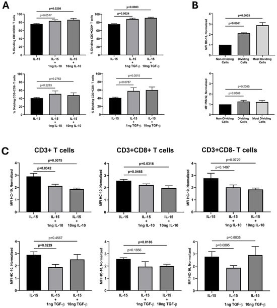 Effects of IL-15, IL-10, and TGF-β on the percentage of dividing T cells and the expression of HC-10 and W6/32 epitopes. Fresh PBLs were isolated and cultured, as indicated in the legend of Figure 1, in the absence or presence of IL-10 and TGF-β. Twelve-day activated PBLs were labeled with W6/32 + GAM-PE or HC-10 + GAM-PE, followed by anti-CD3 and anti-CD8β antibodies, as indicated in the Material and Methods, and analyzed using flow cytometry. (A) Upper graphs show the relative percentage of dividing CD3+CD8+ T cells (Mean ± SEM, n = 4) on gated lymphoblasts upon culture with IL-15 alone or in the presence of 1 ng and 10 ng of IL-10 and TGF-β. Lower graphs show the relative percentage of dividing CD3+CD8− T cells (Mean ± SEM, n = 4) on gated lymphoblasts upon culture with IL-15 alone or in the presence of 1 ng and 10 ng of IL-10 and of TGF-β. (B) The graphs show the normalized HC-10 (upper graph) and W6/32 MFI (lower graph) values (Mean ± SEM, n = 4; see Section 4) on non-dividing CD3+ T cells, total dividing CD3+ T cells and the most dividing CD3+ T cells (≥5–6 cycles of cell division). (C) Upper graphs show the normalized HC-10 MFI values (Mean ± SEM, n = 4) on the most dividing CD3+, CD3+CD8+, and CD3+CD8− T cells upon culture with IL-15 alone or in the presence of 1ng and 10ng of IL-10. Lower graphs show the normalized HC-10 MFI values (Mean ± SEM, n = 4) on the most dividing CD3+, CD3+CD8+, and CD3+CD8− T cells upon culture with IL-15 alone or in the presence of 1 ng and 10 ng of TGF-β. All amounts of cytokines indicated are in ng/mL. p values are indicated.