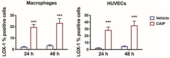 To investigate the involvement of the LOX-1 receptor in the pro-atherosclerotic inflammation induced by CAIP, we assessed its expression on primary human monocytes-derived macrophages (MDMs) and endothelial cells stimulated with the H. cinaedi antigen CAIP. Macrophages and human umbilical endothelial vein cells (HUVECs) were stimulated with CAIP for 24 and 48 h, after which the expression of the LOX-1 receptor was analyzed by flow cytometry. As depicted in Figure 1, both macrophages and HUVECs showed a significant increase in LOX-1 receptor expression following the CAIP stimulation at both time points, suggesting the involvement of the receptor in the pro-atherogenic effect mediated by CAIP.