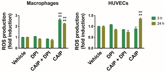 ROS production by macrophages and endothelial cells. Monocytes-derived macrophages and endothelial cells (HUVECs) were treated with CAIP 20 μg/mL or saline (vehicle); where indicated, cells were preincubated 1 h with 20 μM DPI. After 3 and 24 h, cells were incubated 30 min with H2DCFDA probe 10 μM and fluorescence analyzed with a fluorometer (Ex 485 nm, Em 535 nm). Data are expressed as n-fold vs vehicle ± SEM of three independent experiments from three different donors. Significance was determined by Student’s t-test: ** and °° p < 0.01 (** vs. vehicle, °° vs. CAIP + DPI).