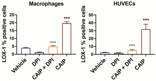 ROS inhibition affects CAIP-induced LOX-1 expression in macrophages and endothelial cells. Monocytes-derived macrophages and endothelial cells (HUVECs) were treated with CAIP 20 μg/mL or saline (vehicle); where indicated, cells were preincubated 1 h with 20 μM DPI. After 24 h, cells were harvested and analyzed by flow cytometry for the expression of LOX-1; cells were gated on Aqua negative cells (live cells). Data are expressed as mean % of positive cells ± SEM of three independent experiments from three different donors. Significance was determined by Student’s t-test: *** CAIP vs. Vehicle p < 0.001; °°° CAIP vs. CAIP + DPI p < 0.001.