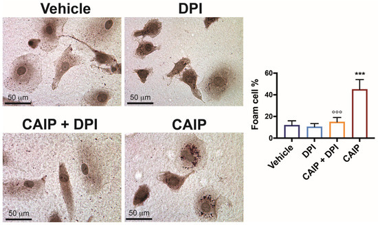 Foam cell formation was evaluated in macrophages treated with 20 μg/mL CAIP or saline and pre-incubated or not with 20 µM DPI, as previously reported [24]. After 24 h, cells were fixed in 4% buffered formalin for 10 min, washed in distilled water, rinsed in 60% isopropanol, and stained with 0.3% Oil Red O for 15 min. Cells were then cleaned in 60% isopropanol and counterstained with hematoxylin. Images were taken with a Leica DMR microscope with 63× magnification. Quantification of the lipid accumulation was performed with Fiji software (version 2.7), as reported elsewhere [45]: cells with more than 10 lipid droplets were defined as foam cells, and the percentage of foam cells formed in each condition was determined according to the previously described method.