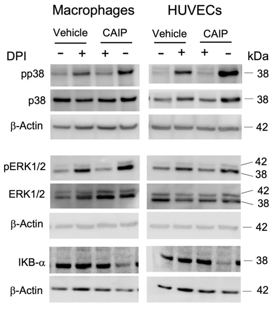 The signaling pathways activated by CAIP are mediated by ROS production. Monocytes-derived macrophages and endothelial cells (HUVECs) were treated with CAIP 20 μg/mL or saline (vehicle); where indicated, cells were preincubated 1 h with 20 μM DPI. After 1 h, cells were harvested and analyzed by Western blot. MAP kinases p38 and ERK1/2, their phosphorylated forms, and IKBα were revealed by specific antibodies. β-actin was used as the endogenous reference. Blot refers to a representative of two independent experiments, performed with cells from two different donors.