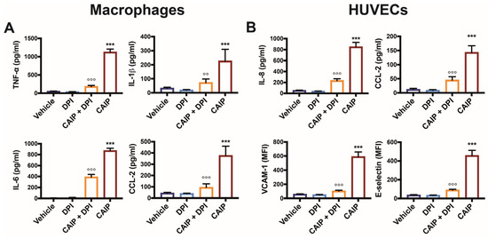 CAIP-mediated cytokines and adhesion molecules production by macrophages and endothelial cells is affected by ROS inhibition. Monocytes-derived macrophages and endothelial cells (HUVECs) were treated with CAIP 20 μg/mL or saline (vehicle); where indicated, cells were preincubated 1 h with 20 μM DPI. After 24 h, culture supernatants were collected and analyzed by ELISA assays, and cells were harvested and analyzed by flow cytometry. For TNF-a, IL-1b, IL-6, IL-8, and CCL-2 analysis, the cytokines content was determined by ELISA following the manufacturer’s instructions. Data are expressed as mean concentration values ± SEM of three independent experiments with cells derived from three different donors (for both macrophages and HUVECs). The surface expression of VCAM-1 and E-selectin was evaluated on cells gated on live cells. Data are expressed as Mean Fluorescence Intensiti (MFI) ± SEM of three independent experiments, performed with cells from three different donors. Significance was determined by Student’s t-test: *** CAIP vs. Vehicle p < 0.001; CAIP vs. CAIP + DPI °° p < 0.01, °°° p < 0.001.