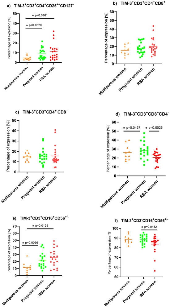 - Zhuang, X.; Xia, X.; Liu, L.; Zhang, Y.; Zhang, X.; Wang, C. Expression of Tim-3 in peripheral blood mononuclear cells and placental tissue in unexplained recurrent spontaneous abortion. Medicine 2018, 97, e12099. [Google Scholar] [CrossRef]