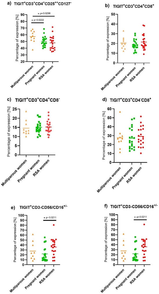 - Wang, Y.; Li, D.; Yu, T.; Hu, M.; Xing, J.; Bai, S.; Qu, W.; Tong, X. Dynamics of TIGIT and PD-1 expression on NK cells during the course of normal pregnancy. Immunol. Lett. 2021, 230, 42–48. [Google Scholar] [CrossRef]