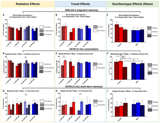 Our hypothesis that irradiation would affect long-term memory on the NOR was not confirmed. There were no effects of travel, irradiation, sex, or genotype on the percentage time spent exploring the novel object after a 24 h inter-trial interval (Figure 2A–C).